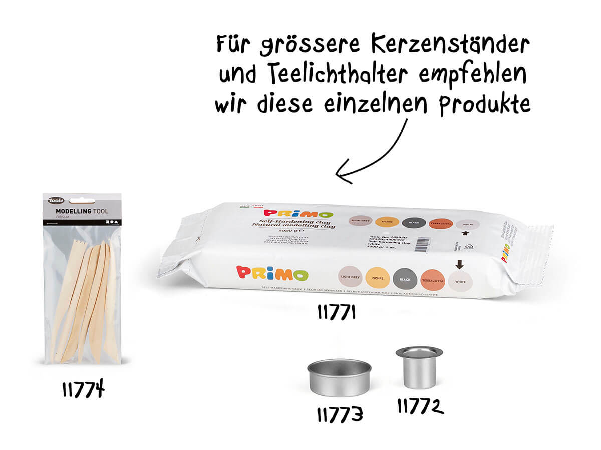 Kerzen schaffen Wärme und Atmosphäre – noch besonderer wird es, wenn der Kerzenhalter selbstgemacht ist. Mit lufttrocknender Primo Modelliermasse formen Sie ganz einfach Ihren eigenen Kerzenständer: ob schlicht, verspielt oder modern – jedes Stück wird einzigartig. Nach dem Trocknen können Sie Ihr Werk mit Farbe oder Klarlack veredeln und so zu einem echten Hingucker machen. Entdecken Sie, wie viel Freude es macht, etwas Eigenes zu schaffen!