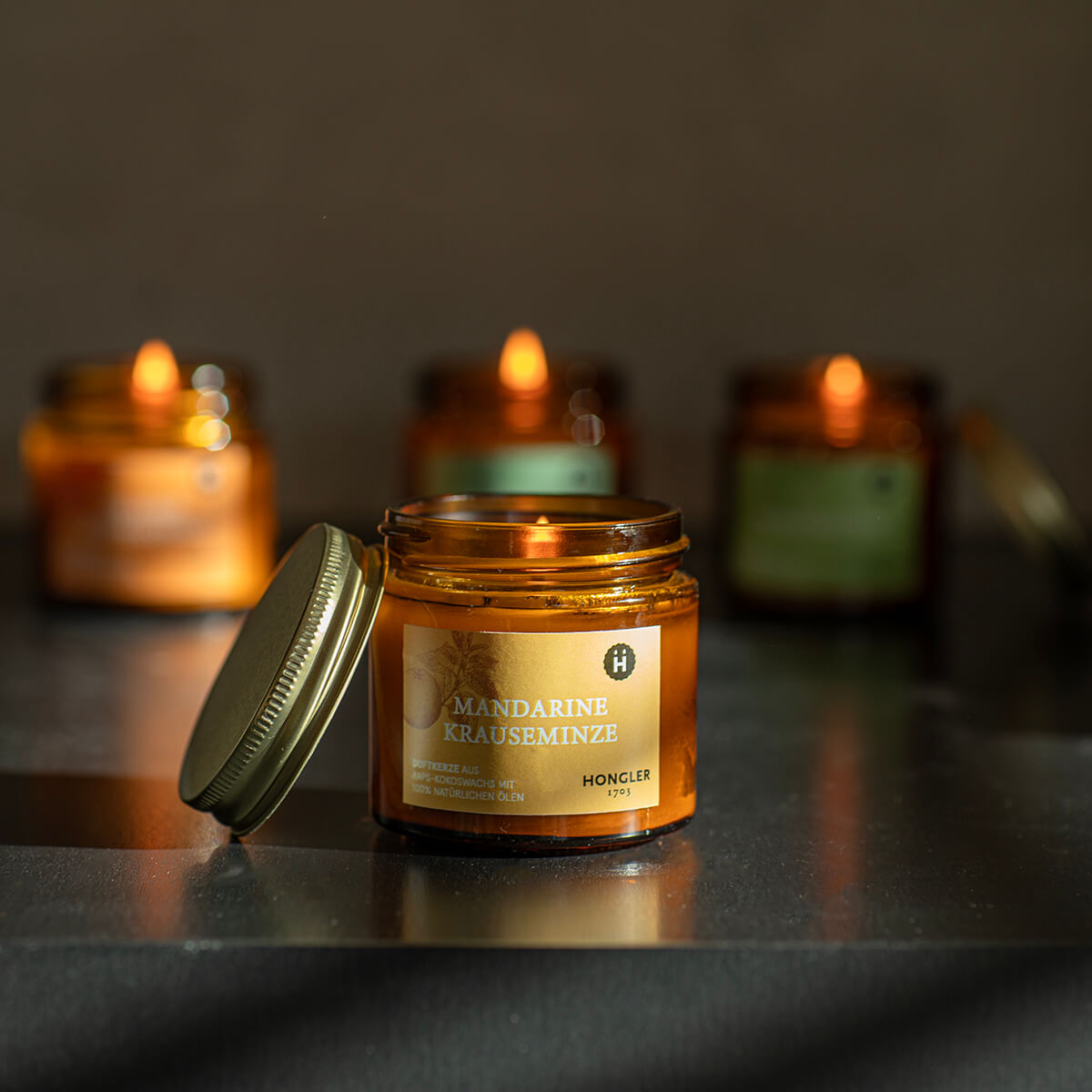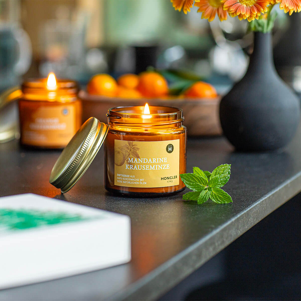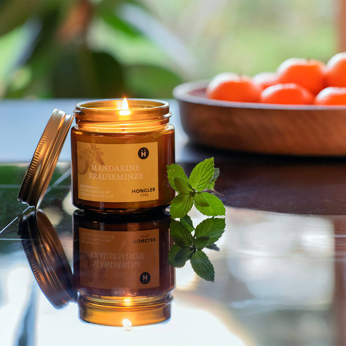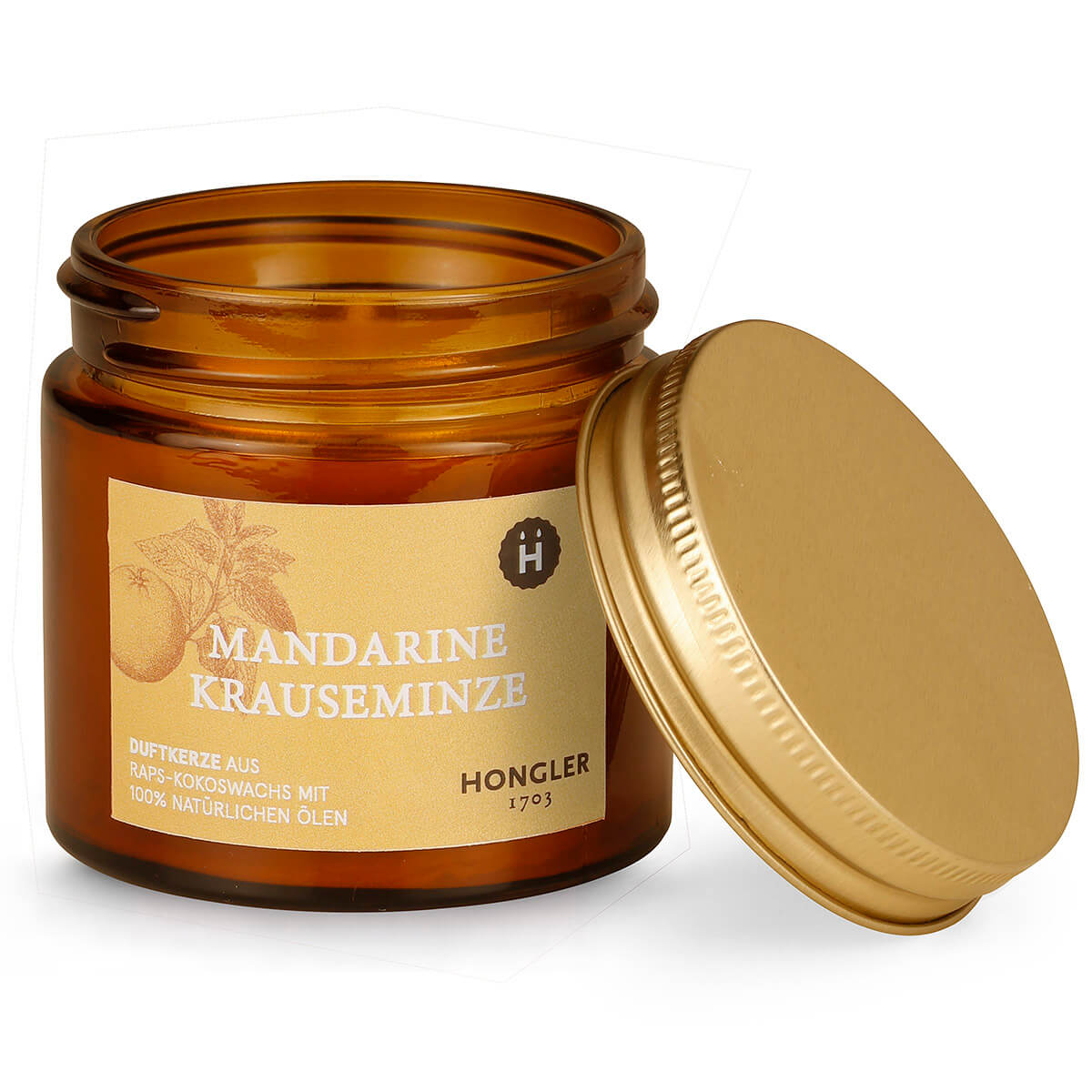 Duftkerze Hongler Mandarine Krauseminze – rein natürliche Öle – vegan – aus Raps-Kokoswachs