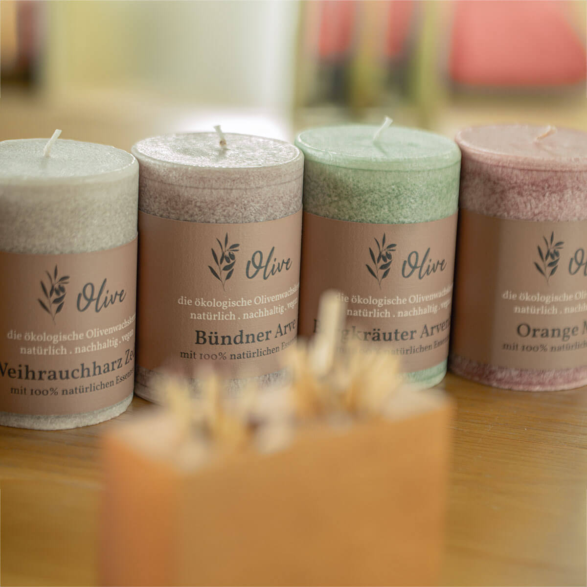 Duftkerze Schulthess aus Olivenwachs-Stearin – 100/65 mm – Bergkräuter Arvenholz – rein natürliche Öle – vegan
