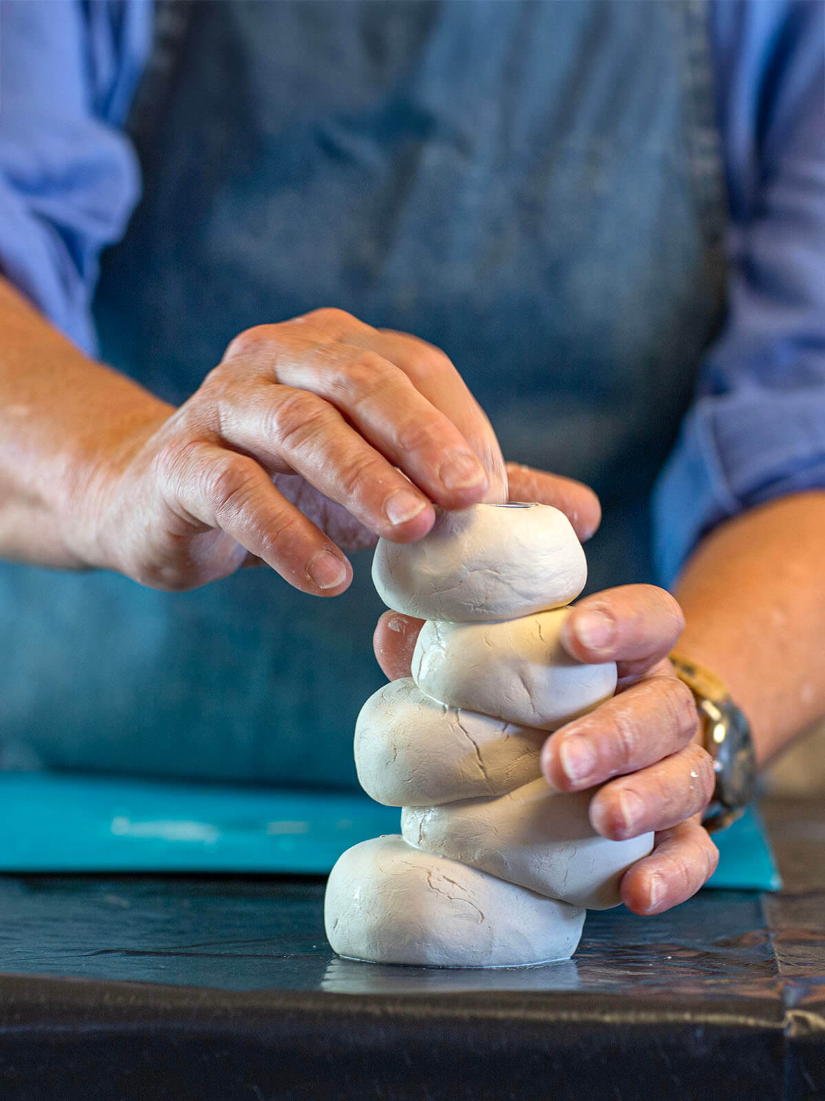 Ring (Donut) mit Standfuss verbinden: Flächen anfeuchten, eingeritzte Wurst auflegen, andrücken und glattstreichen. Während des Trocknens Form kontrollieren und ggf. korrigieren.