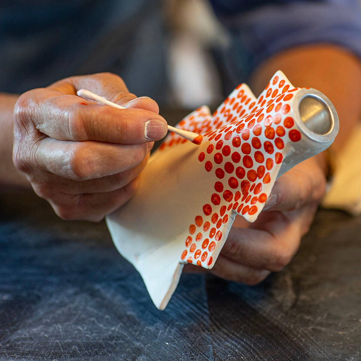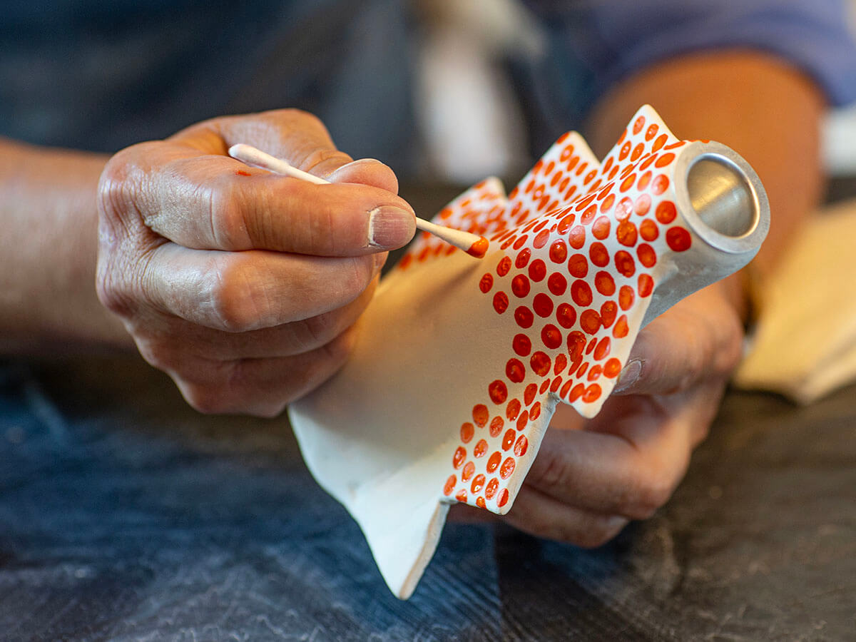 Nach dem vollständigen Trocknen Unebenheiten mit Schleifpapier glätten. Optional bemalen oder lackieren. Farbtupfer lassen sich mit einem Wattestäbchen auftragen.