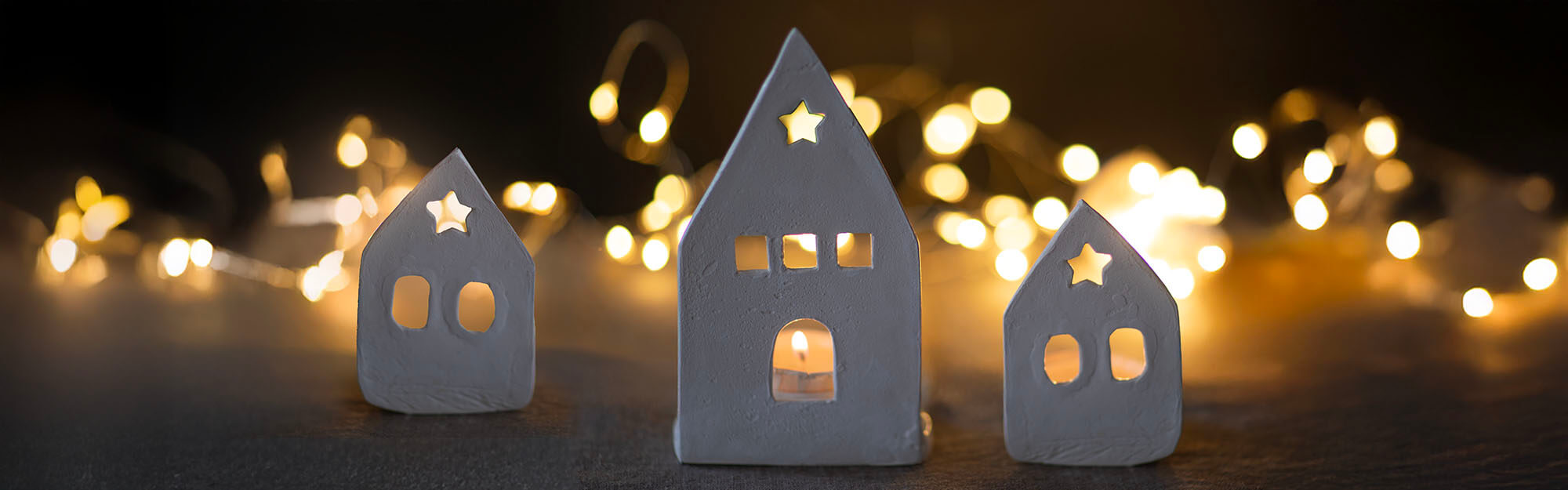 Modelliermasse gut durchkneten, 3–5 mm dick ausrollen, auf ein Stück Klarsichtmäppli legen, Schablone auflegen und Häuschen ausschneiden.