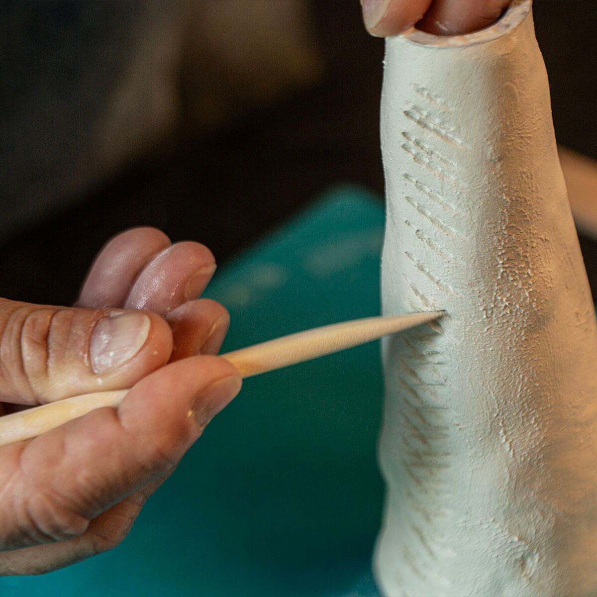 Die grösste Kugel mit einem Töpferwerkzeug oder einem Zahnstocher kreuzweise dort einritzen, wo die zweite Kugel platziert werden soll. Durch das Einritzen, verbinden sich die verschiedenen Elemente besser.