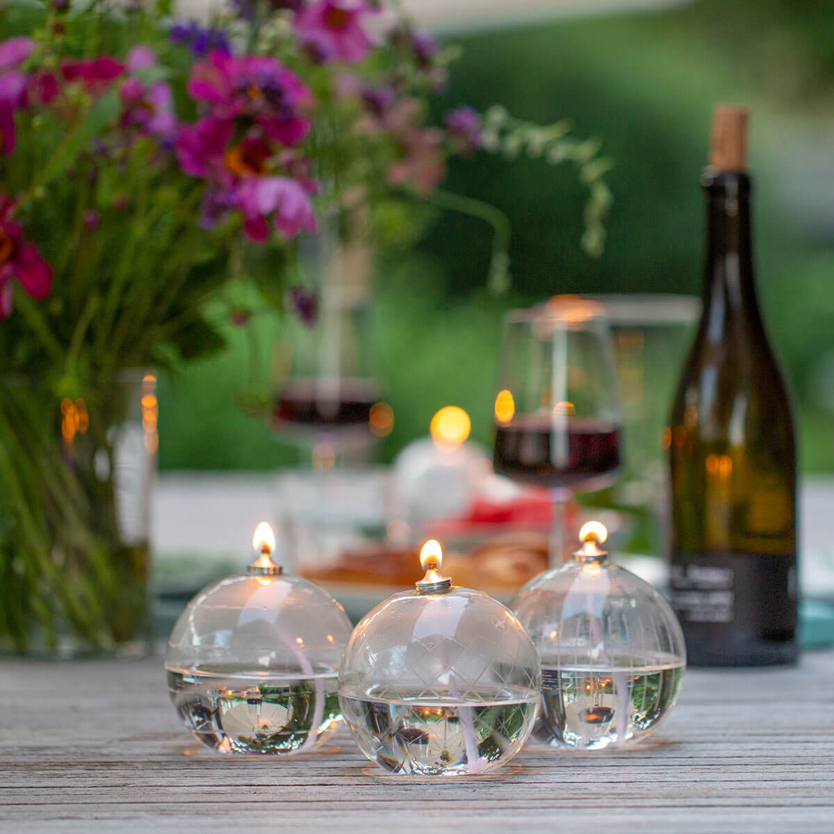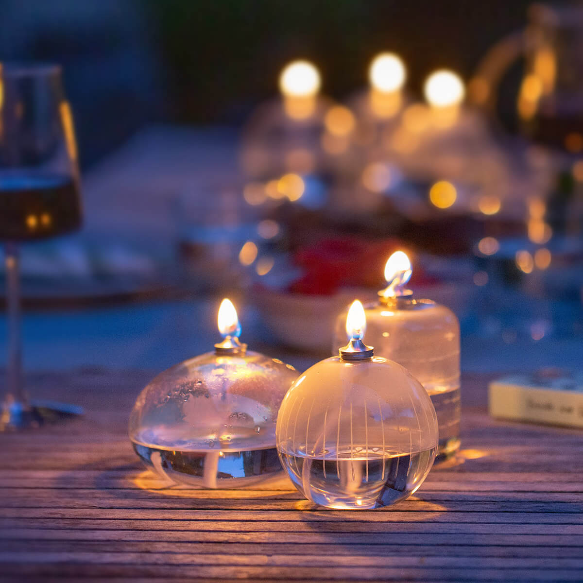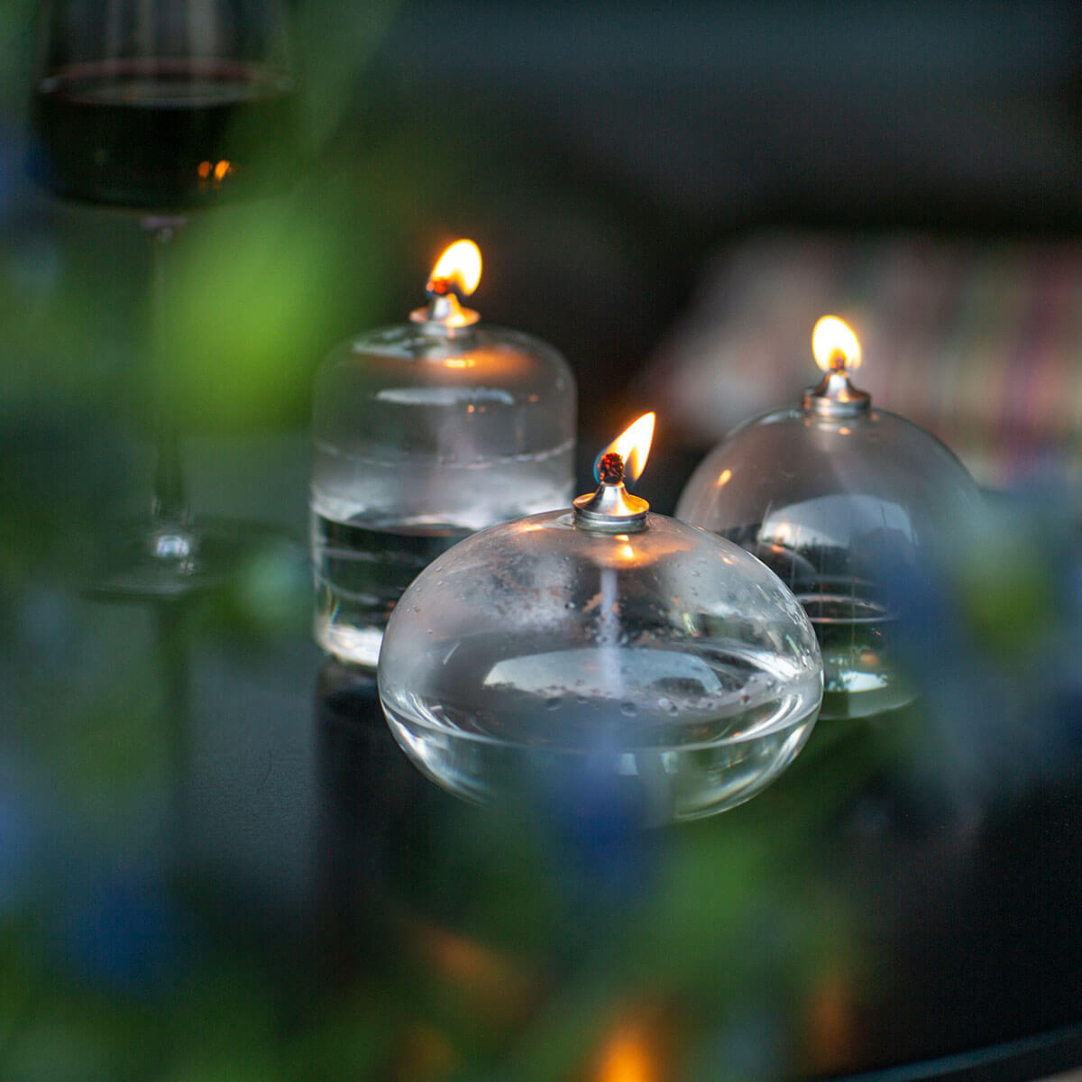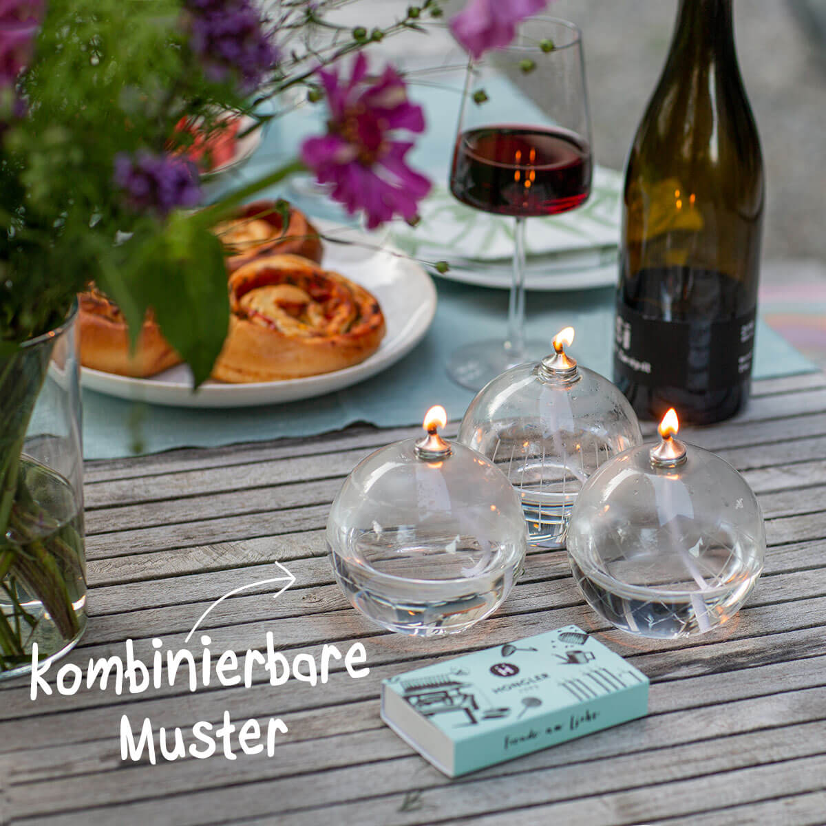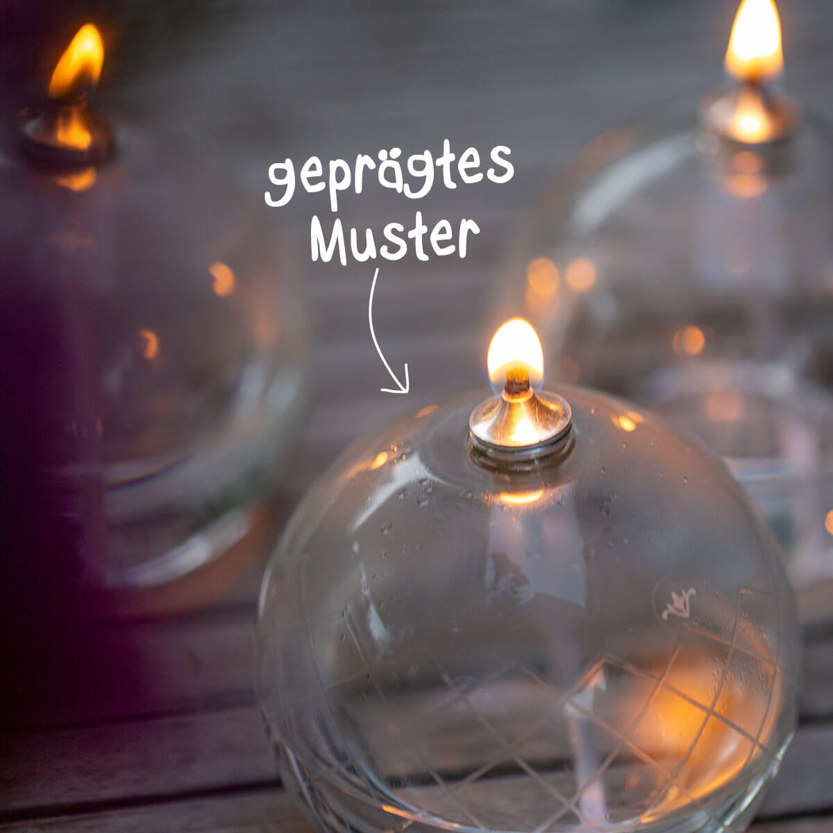 Die leuchtenden Öllampen hüllen deine Sommertafel in ein sanftes Licht und schaffen ein stimmungsvolles Ambiente. Für das einfache Einfüllen des Lampenöls ist jedem Öllicht ein Glastrichter beigelegt. Die Gläser sind mit diversen eingeprägten Mustern erhältlich, die sich wunderbar kombinieren lassen. Ein Deckel für den Schutz des Dochtes bei Nichtgebrauch ist ebenfalls inbegriffen. Die Gläser sind mundgeblasen – kleine Blasen und Unregelmässigkeiten können auftreten.