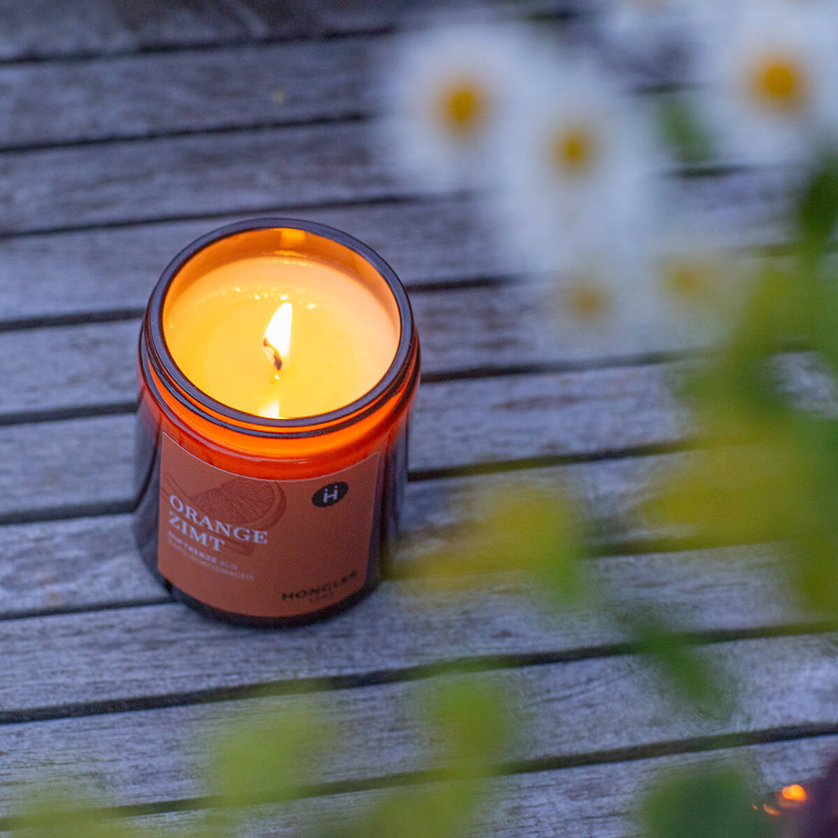 Das Weckglas schützt die Flamme vor dem Erlöschen. Für die von Hand gegossenen Windlichter wird ein rein pflanzliches Raps-Kokoswachs verwendet.