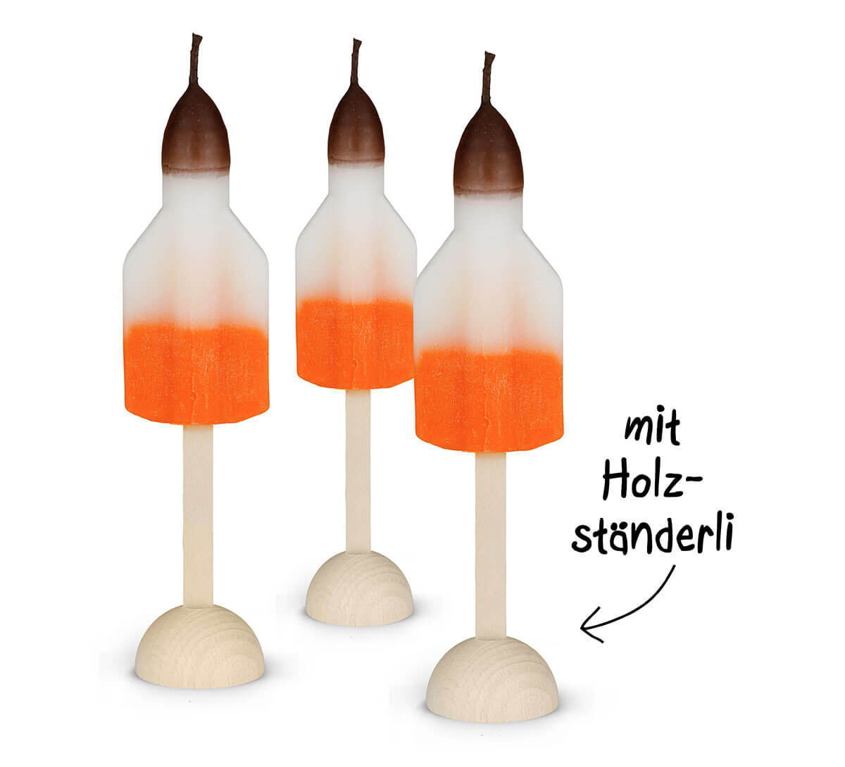 Damit die Raketenglacekerze nicht abhebt, kommt sie mit einem massgeschneiderten Holzständerli daher. Schlicht, stabil und aus unbehandeltem Holz gefertigt, hält es die Kerze sicher an Ort und Stelle.