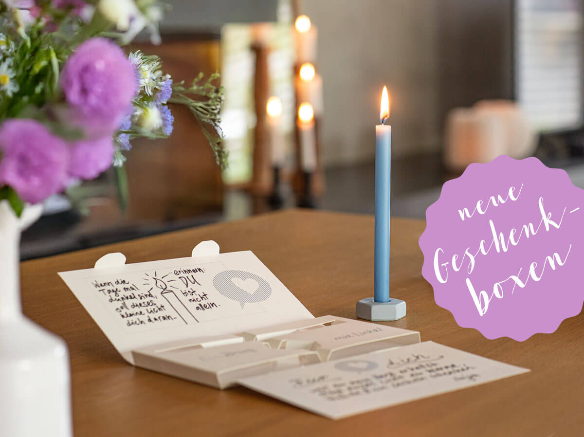 Geschenkboxen sind kleine Botschafter voller Wärme und Bedeutung. Jede Box enthält eine handgefertigte Kerze sowie einen Kerzenhalter aus hochwertigem Kera-Guss. Die stabile Kartonbox eignet sich ideal für den Versand per Post und bietet zwei beschreibbare Flächen, auf denen persönliche Worte Platz finden.