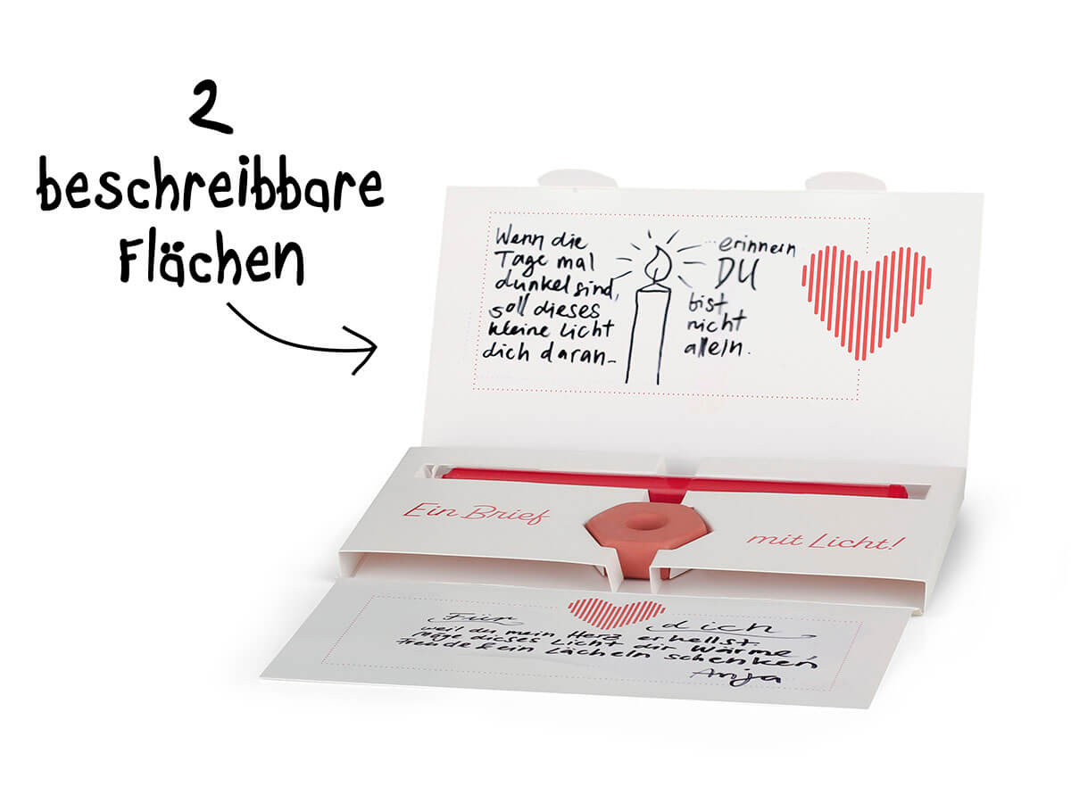 Zeigen Sie Ihren Liebsten mit dem Brieflicht, dass Sie an sie denken! Brieflichte sind aussergewöhnliche Lichtboten zu Weihnachten, im Advent, zu Traueranlässen oder Familienfesten – als individueller Gruss oder als Mailing an einen grösseren Kreis. Das Set bestehend aus Kerze, Kerzenständer, Karte und Versandschachtel passt in jeden Briefkasten und bereitet ganz einfach Freude. Das Brieflicht lässt sich als Briefpost mit 2 cm Dicke versenden.