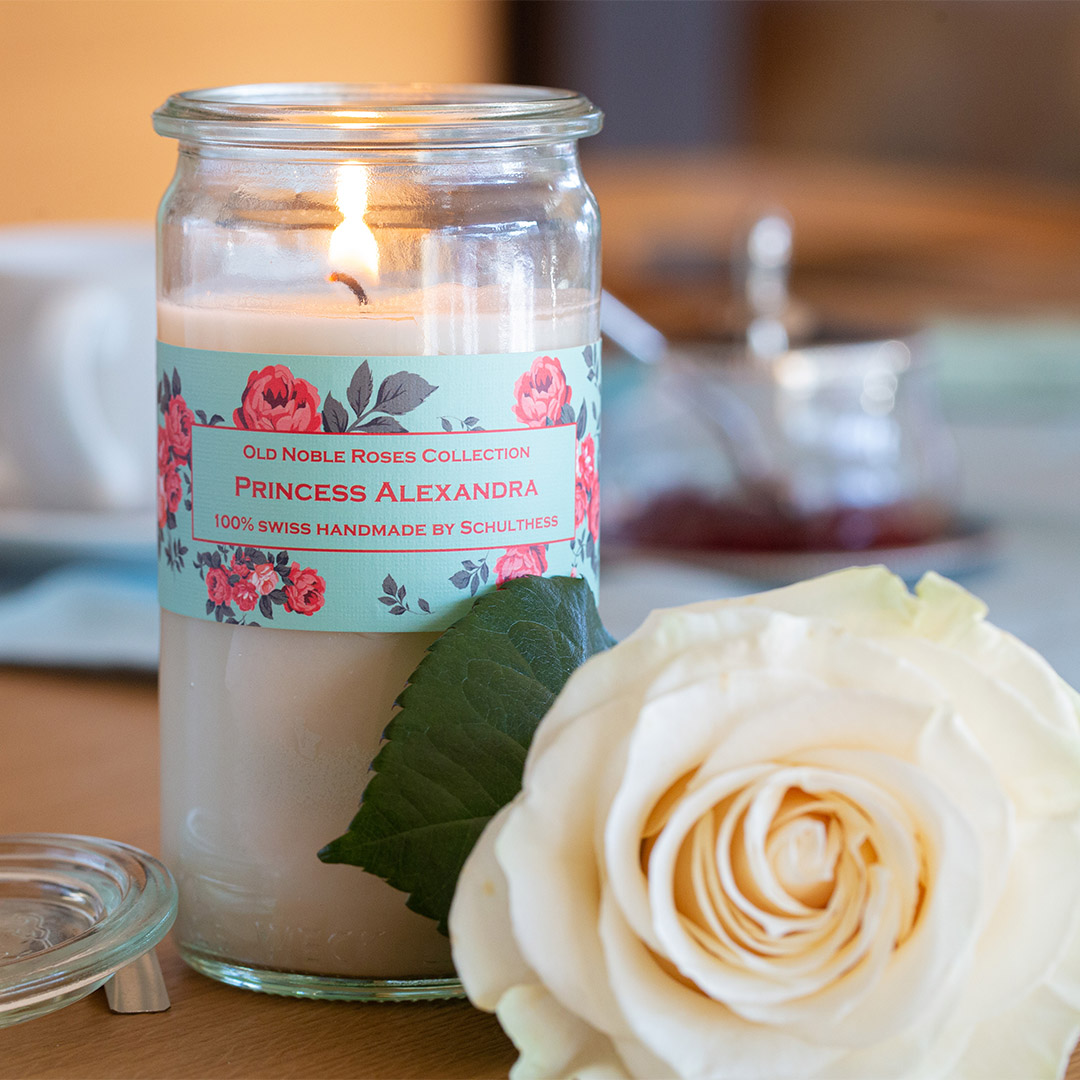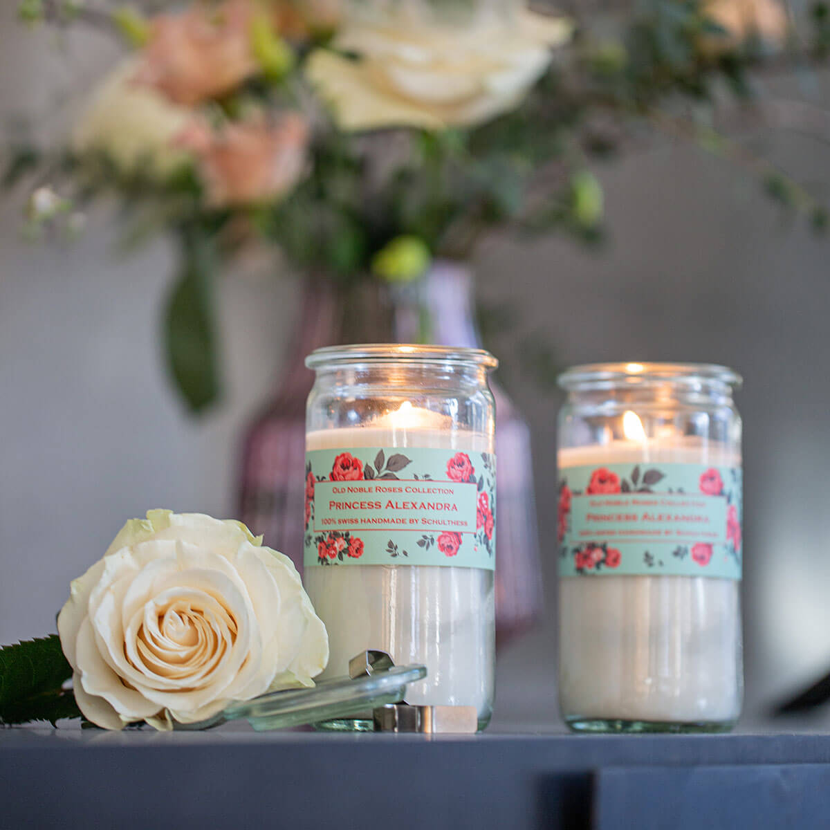 Gerne möchten wir Ihnen die neuen Duft-Windlichter von Schulthess Kerzen vorstellen. Die feinen Düfte der Old Noble Roses Kerzen passen ideal zum Muttertag. Die Collection umfasst vier verschiedene Rosendüfte: Heritage, Spirit of Freedom, Princess Alexandra und Annapurna. Das Weckglas schützt die Flamme vor dem Erlöschen. Die Kerzen brennen jeweils ca. 45 h lang. Das Weckglas kann wiederverwendet werden. Für die von Hand gegossenen Windlichter wird ein rein pflanzliches Raps-Kokoswachs verwendet.