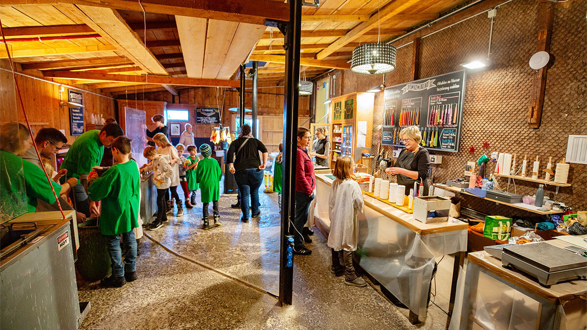 In eigener Regie können alle, die Freude am Kerzenziehen haben, diese nach Lust und Laune in der Kerzenzieh-Scheune ausleben. Es stehen Bienenwachs, aber auch farbiges Paraffin und die ganze Infrastruktur zur Verfügung. Die genauen Öffnungszeiten und Preise für dieses Jahr finden Sie in diesem >Infoblatt.